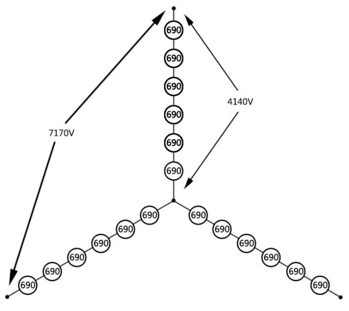 VFPS系列岸電電源系統(tǒng)采用功率單元串聯的形式,電壓疊加的原理類似于“電池組疊加”技術。當需要6.6kV輸出時,每相串聯6個功率單元,每個功率單元輸出的交流有效值為634V,相電壓3810V,線電壓6600V。每個單元最高可以輸出690V,系統(tǒng)最高可以輸出7170V。