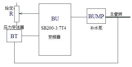 為更進(jìn)一步的節(jié)能,對(duì)換熱站實(shí)施了自動(dòng)化改造,循環(huán)泵和補(bǔ)水泵用變頻調(diào)節(jié),整個(gè)城市供熱系統(tǒng)用計(jì)算機(jī)進(jìn)行監(jiān)控,實(shí)現(xiàn)了換熱站無(wú)人值守。通過(guò)循環(huán)泵使熱水在供熱系統(tǒng)中運(yùn)行,管道、閥門的泄漏引起循環(huán)水的水壓降低,如不及時(shí)補(bǔ)水,會(huì)造成供熱系統(tǒng)運(yùn)行不正常。補(bǔ)水泵的變頻泵補(bǔ)水方式比較簡(jiǎn)單,采用恒壓供水方式,設(shè)定壓力為4kg。本例選用一臺(tái)SB200-3.7T4變頻器,選用森納斯DG130W-BZ-A 1MPa壓力變送器,變頻調(diào)速補(bǔ)水系統(tǒng)如圖所示: