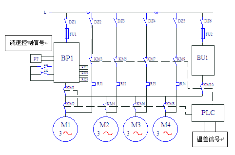 圖中,BP1—森蘭SB200-37T4變頻器,BU—軟啟動(dòng)器(自耦減壓起動(dòng)器),系統(tǒng)采用循環(huán)投切方式,溫差信號(hào)送入PLC,經(jīng)過(guò)PLC處理后,到變頻器作為調(diào)速控制信號(hào)。整個(gè)系統(tǒng)的運(yùn)行信息由PLC送到計(jì)算機(jī)上。