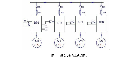 由于城市自來水的用量隨季節(jié)的變化而變化,隨每日時段不同而變化。為使供水的水壓恒定,最常見的辦法是采用變頻恒壓供水系統(tǒng),即壓力變送器裝在主管網(wǎng)上檢測管網(wǎng)壓力信號,再將此壓力信號送到變頻器(PLC)的模擬信號輸入端口,由此構成壓力閉環(huán)控制系統(tǒng),管網(wǎng)壓力的恒定依賴變頻器的調節(jié)控制。對于多泵情況,可以兩種不同的控制系統(tǒng)方案,一種是“順序控制方案”,系統(tǒng)圖如圖一所示: