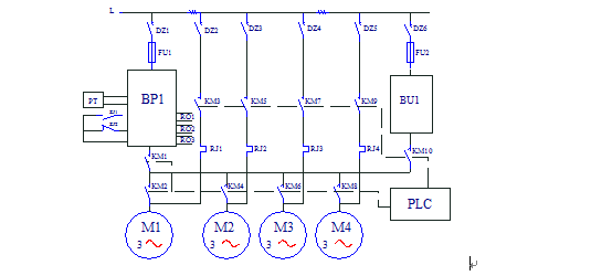 圖中:BP1—變頻器;BU2~BU4--軟起動器,PT—壓力變送器。由圖一可見,變頻器連接在第一臺水泵電機上,需要加泵或減泵時,由變頻器RO1~RO3端口輸出信號起動或停止其他的水泵,這時水泵的起動采用自耦降壓起動裝置或軟起動器。這種方案的特點是水泵電機不需要在變頻和工頻之間切換;第一臺水泵永遠連接在變頻器上,沒有切換過程中的失壓現(xiàn)象;由于變頻泵以外的泵都有軟起動器,所以不需要再做備用系統(tǒng),當變頻器故障時,可用軟起動器手動起動M2~M4水泵,保證供水不致中斷;每臺電機都有起動器,初始投資較大。另一種是“循環(huán)投切”方案,系統(tǒng)圖如圖二所示