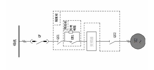 限流柜由高壓真空接觸器KM1與充電電阻R組成,限流電阻實(shí)現(xiàn)對(duì)變頻器電容軟充電,使上電過程中對(duì)電網(wǎng)無沖擊。
