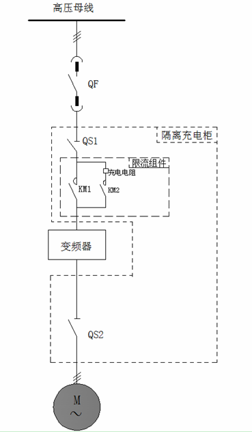考慮到用戶現(xiàn)場電網(wǎng)容量有限、電機功率較大。為了避免在送電瞬間的沖擊電流,故在主回路中增加充電電阻。用來減小沖擊電流及控制母線電壓降。主回路采用真空接觸器并實現(xiàn)在完成充電后自動投切。采用現(xiàn)場控制箱和DCS系統(tǒng)對高壓變頻器進行控制、監(jiān)測。